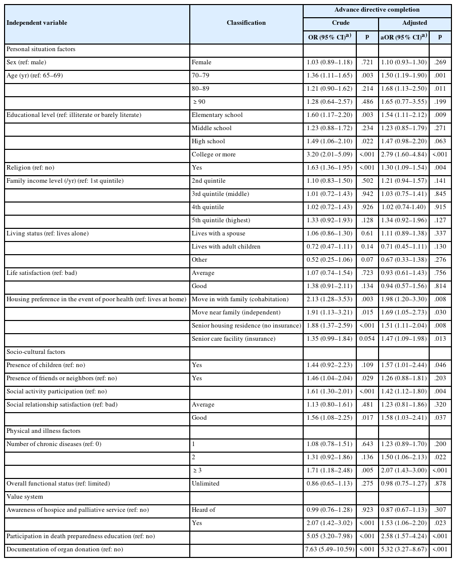 | Independent variable | Classification | Advance directive completion | |||