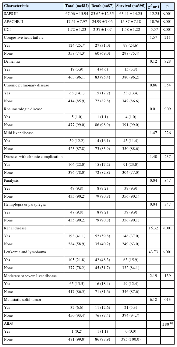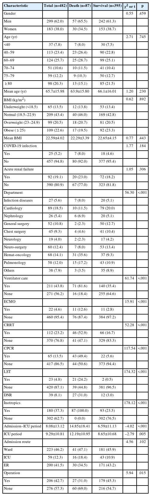 | Characteristic | Total (n=482) | Death (n=87) | Survival (n=395) | χ2 or t | p |