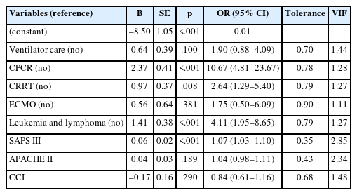 APACHE, Acute Physiology and Chronic Health Evaluation; CCI, Charlson Comorbidity Index; CI, confidence interval; CPCR, cardiopulmonary cerebral resuscitation; CRRT, continuous renal replacement therapy; ECMO, extracorporeal membrane oxygenation; OR, odds ratio; SAPS, Simplified Acute Physiology Score; SE, standard error; VIF, variance inflation factor.