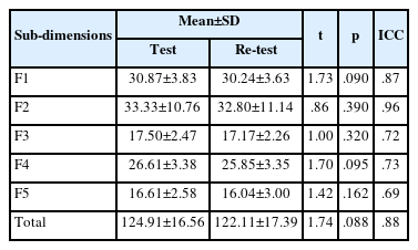| Sub-dimensions | Mean±SD | t | p | ICC | |