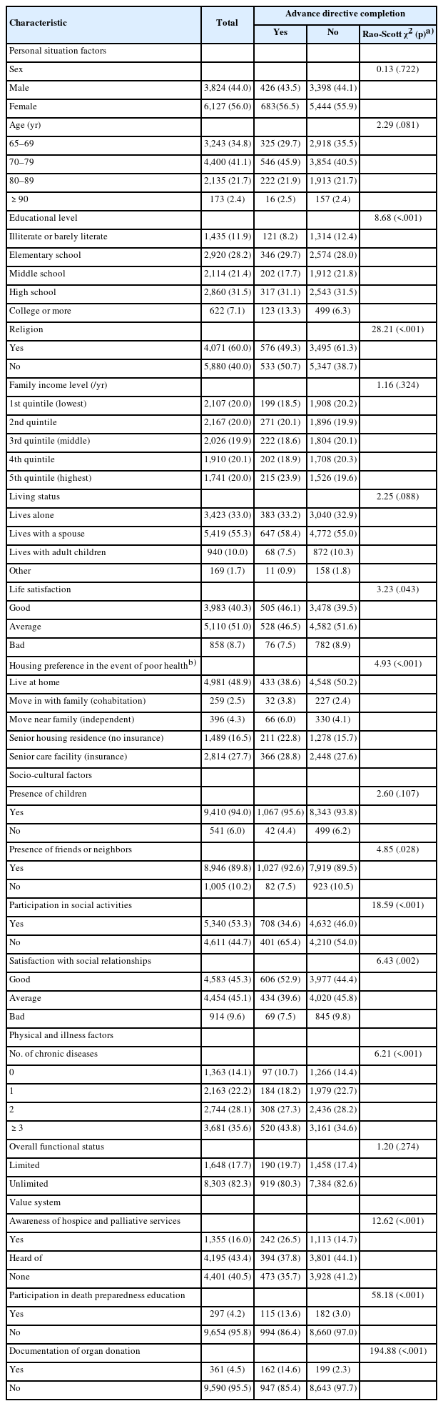 | Characteristic | Total | Advance directive completion | ||