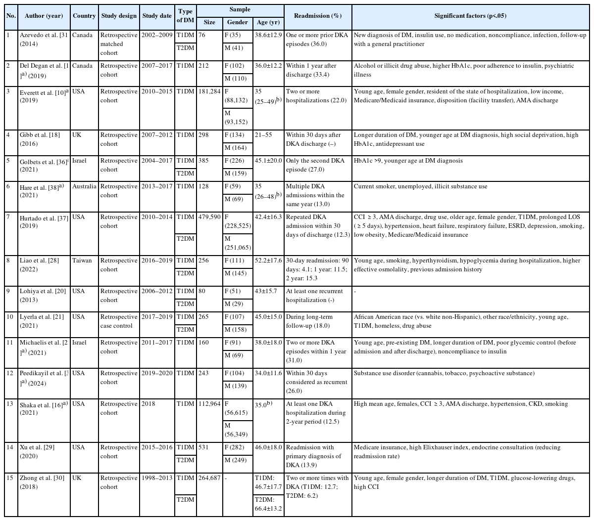 | 13 | Shaka et al. [16]a) (2021) | USA | Retrospective cohort | 2018 | T1DM | 112,964 | F (56,615) | 35b) | At least one DKA hospitalization during 2-year period (12.5) | High mean age, female gender, CCI ≥3, AMA discharge, hypertension, CKD, smoking |