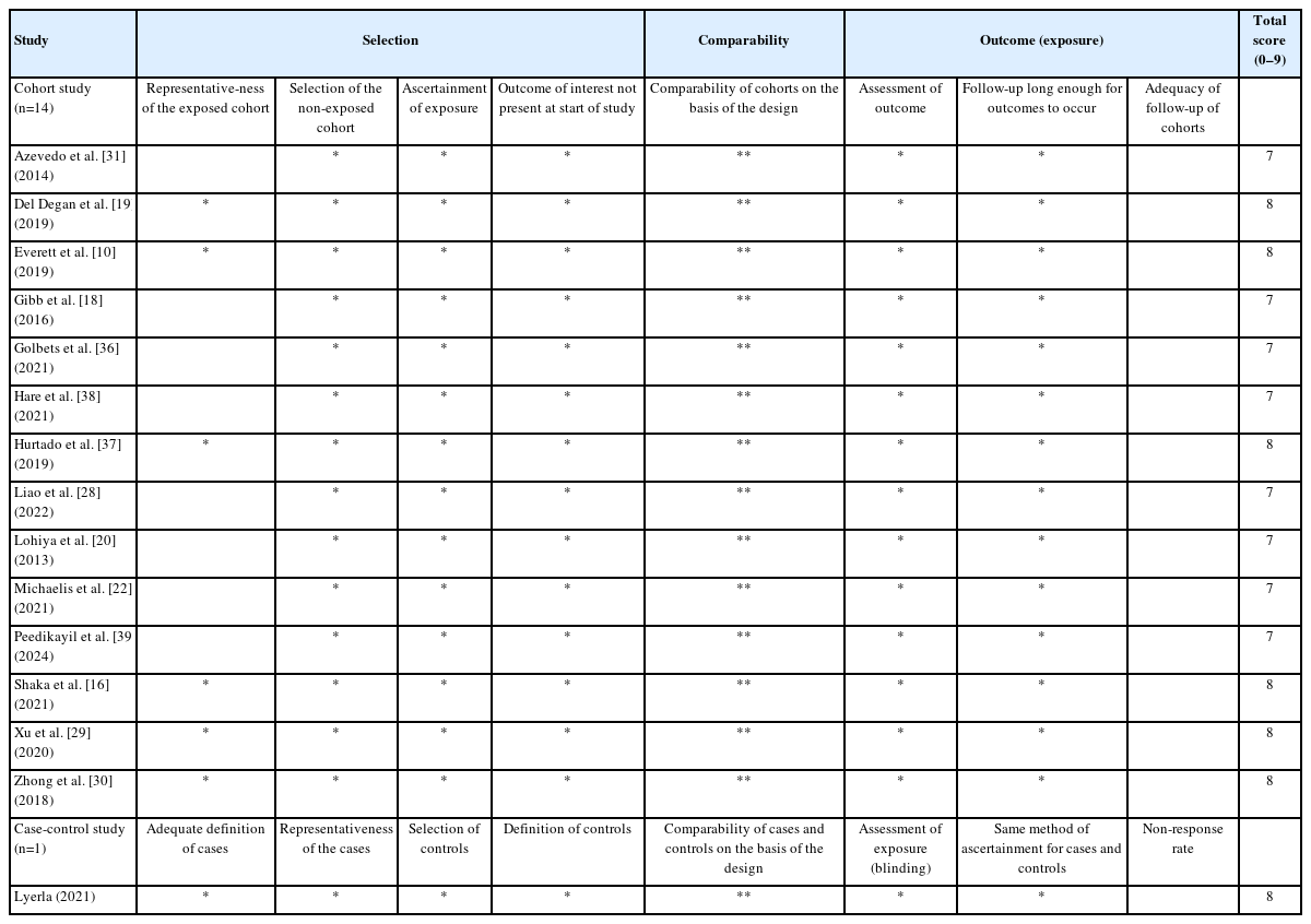 | Cohort study (n=14) | Representativeness of the exposed cohort | Selection of the non-exposed cohort | Ascertainment of exposure | Outcome of interest not present at start of study | Comparability of cohorts on the basis of the design | Assessment of outcome | Follow-up long enough for outcomes to occur | Adequacy of follow-up of cohorts | |