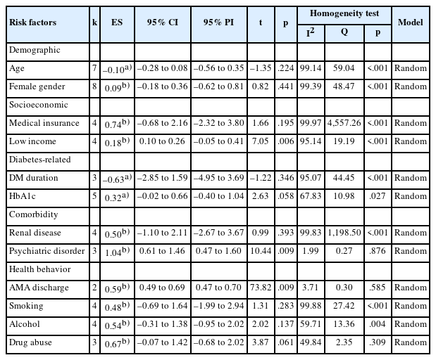 AMA, against medical advice; CCI, Charlson comorbidity index; CI, confidence interval; DM, diabetes mellitus; ES, effect size; HbA1c, hemoglobin A1c; PI, prediction interval. a)Standardized mean difference. b)Log odds ratio.