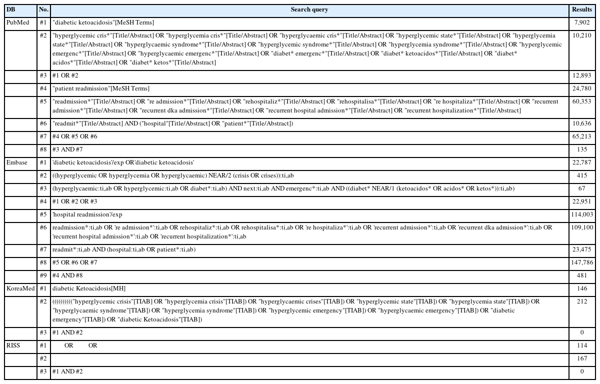 | Korea-Med | #1 | (diabetic ketoacidosis[MH]) OR (((((((((("hyperglycemic crisis"[TIAB] OR "hyperglycemia crisis"[TIAB]) OR "hyperglycaemic crises"[TIAB]) OR "hyperglycemic state"[TIAB]) OR "hyperglycemia state"[TIAB]) OR "hyperglycaemic syndrome"[TIAB]) OR "hyperglycemia syndrome"[TIAB]) OR "hyperglycemic emergency"[TIAB]) OR "hyperglycaemic emergency"[TIAB]) OR "diabetic emergency"[TIAB]) OR "diabetic Ketoacidosis"[TIAB]) | 220 |