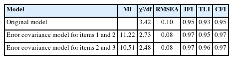 CFI, comparative fit index; IFI, incremental fit index; MI, modification index; RMSEA, root mean square error of approximation; SRMR, standardized root mean squared residual; TLI, Tucker-Lewis index.