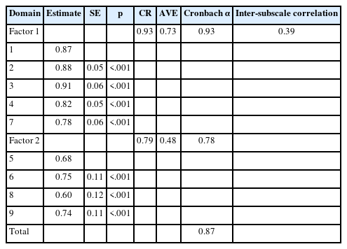 | Domain | Estimate | SE | p | CR | AVE | Cronbach α | Inter-subscale correlation |