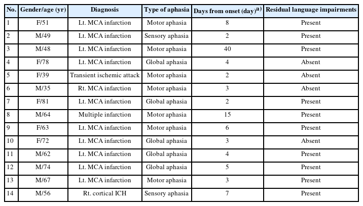 | No. | Gender/age (yr) | Diagnosis | Type of aphasia | Days from onset (day)a) | Residual language impairments |