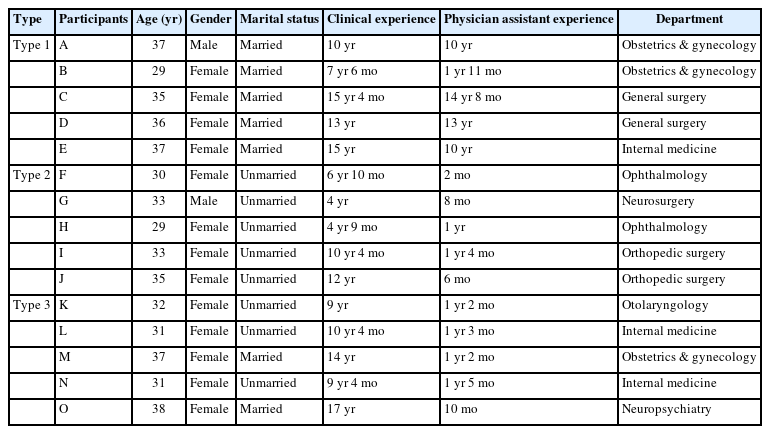 | Participants | Age (yr) | Gender | Marital status | Clinical experience | Physician assistant experience | Department | |