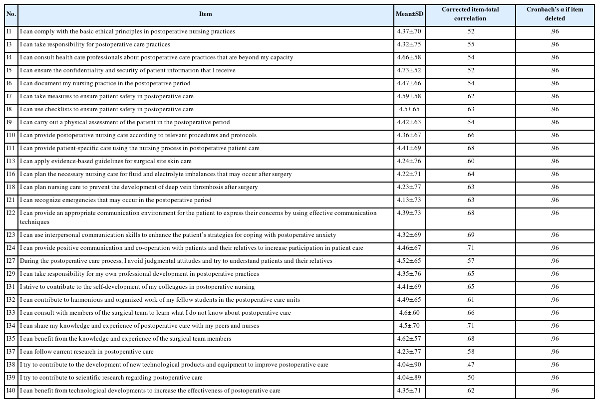 | I37 | I can follow current research in postoperative care | 4.23±.77 | .58 | .96 |