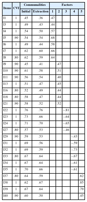 F1: legal responsibilities and ethical principles, F2: postoperative nursing care, F3: interpersonal relations and communication, F4: leadership, F5: education and professional development. CVI, content validity index; EFA, exploratory factor analysis.